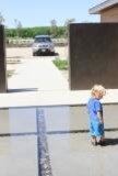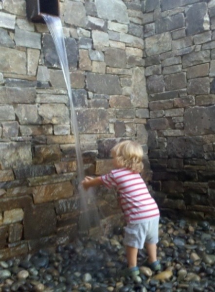 Four large square step pads within a larger square and three water levels. One level -- with just a bit of water over the stepping pads -- gives the illusion of walking on water. This was originally designed as a memorable entry feature as well as a sophisticated play pool that cools the entire courtyard.